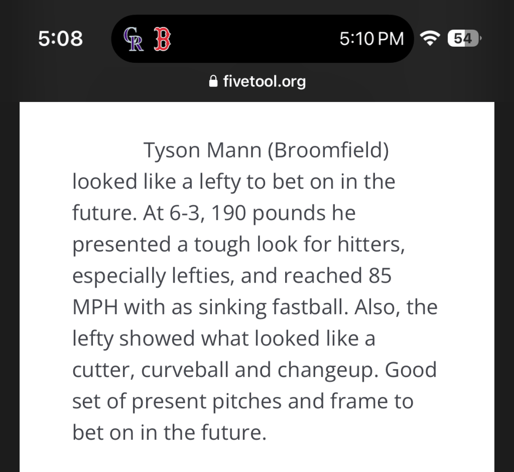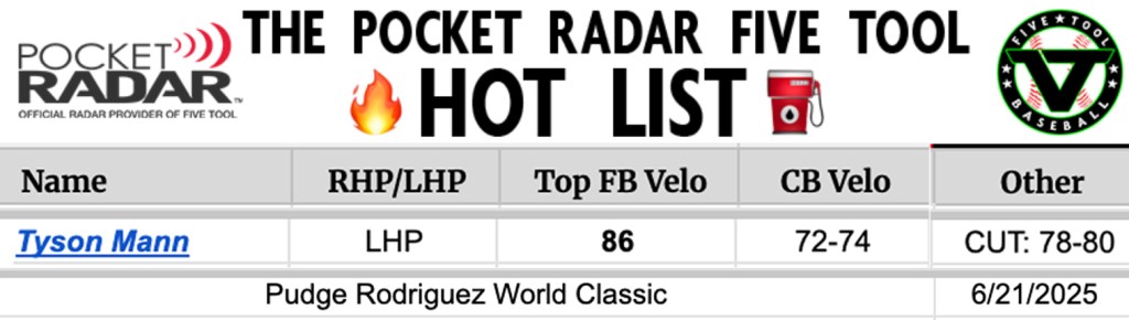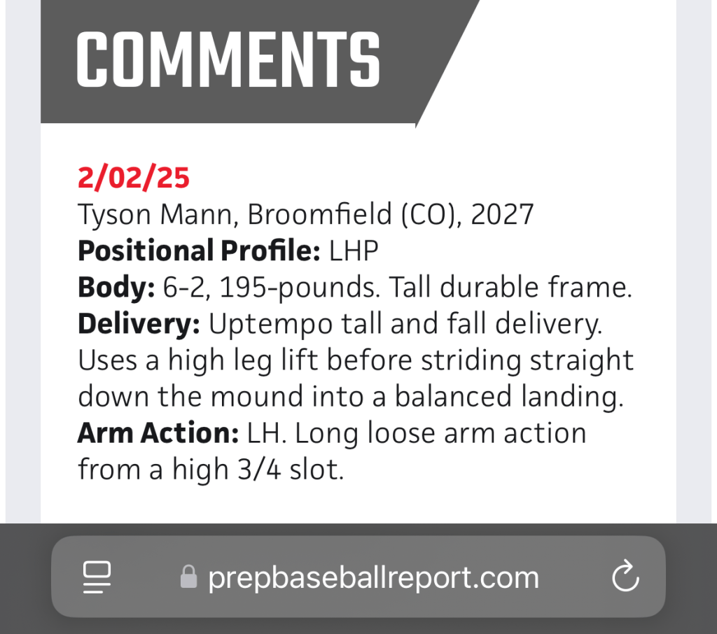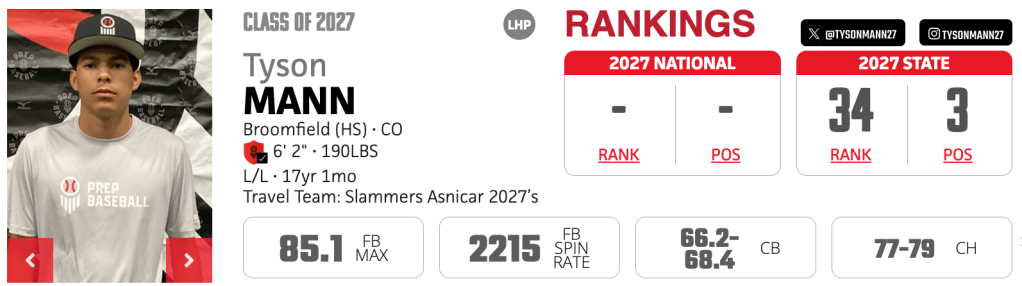 Paired with teammate Jameson Clegg to pitch no-hitter (Clegg 5 innings; Mann 2): Slammers Asnicar 2027 vs.