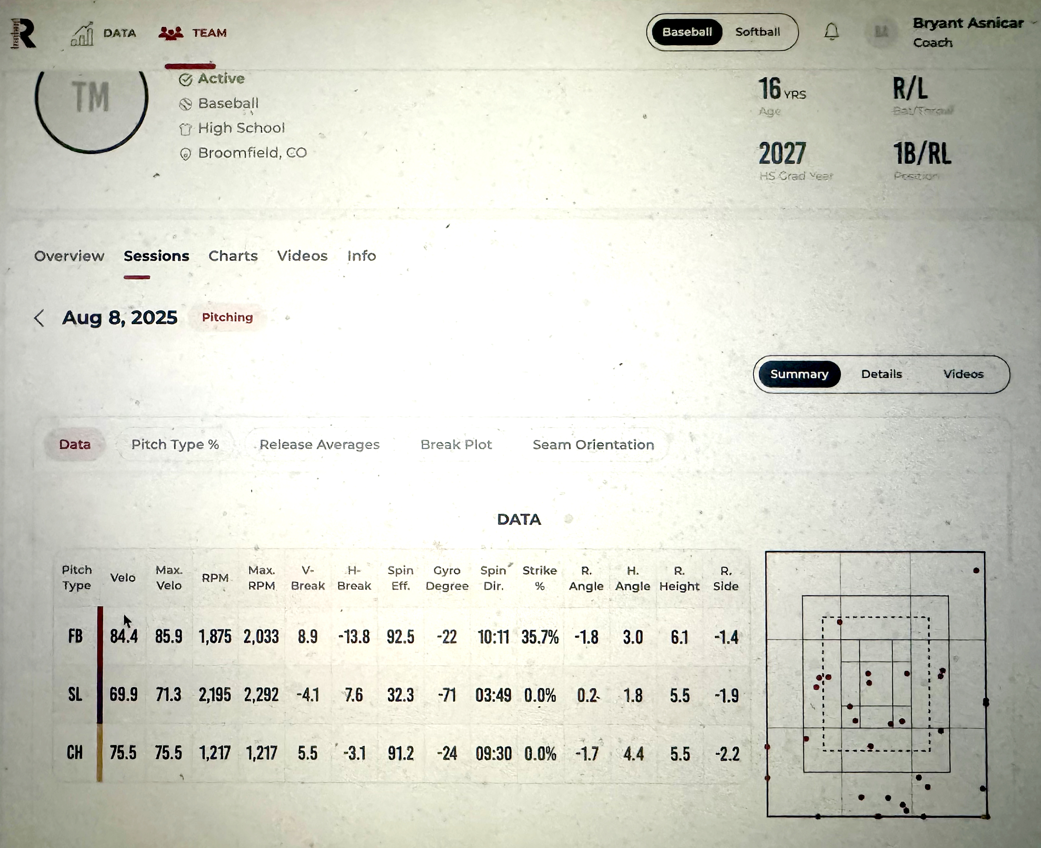 • Velo: 84-86 MPH, top 89 MPH