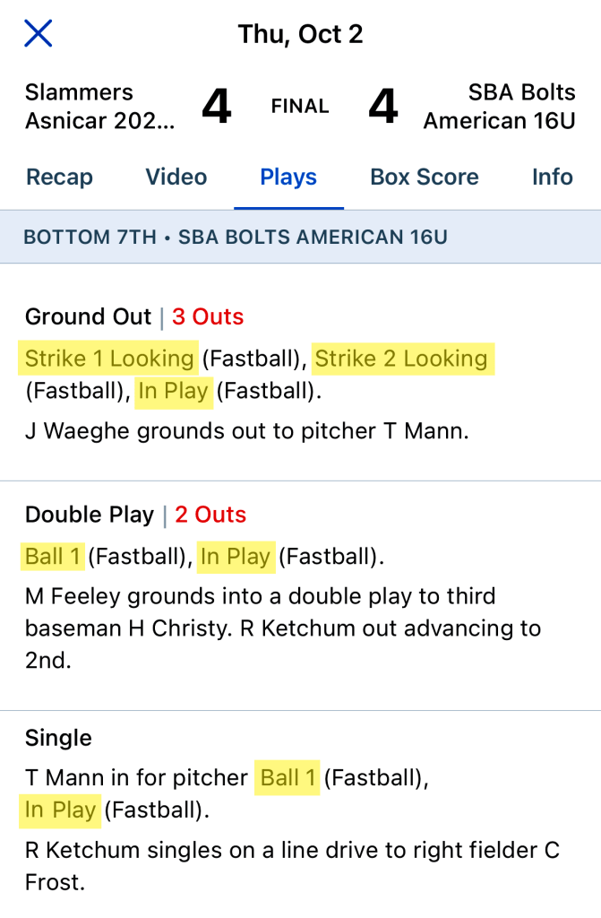 (5 strikes; 2 balls). (GameChanger video was not working.)